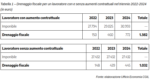 Le stime sono quelle della CGIL, le cui simulazioni svelano anche come il drenaggio fiscale abbia sottratto potere d’acquisto negli ultimi anni al lavoro dipendente anche in presenza di rinnovi contrattuali e riforme IRPEF.